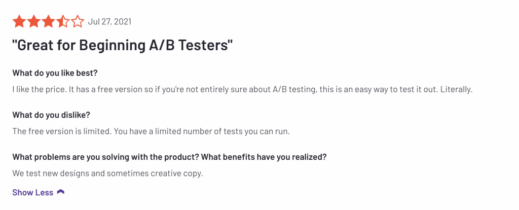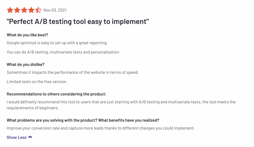 Here are some of the reviews about the Google Optimize A/B testing tool from G2 website:
