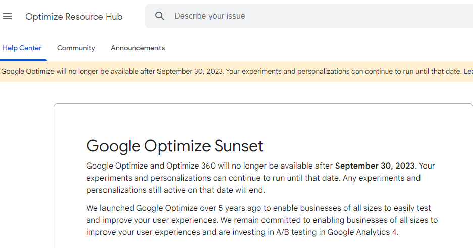 Google recently announced that Google Optimize would no longer be available for use after September 30, 2023. Google Optimize has been an effective and free A/B Testing and Experimentation platform available to marketers for over five years. However, Google said it does not have features and services that its customers require to run A/B tests properly.