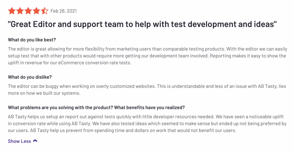 Here are some of the reviews about the AB Tasty tool from G2 website