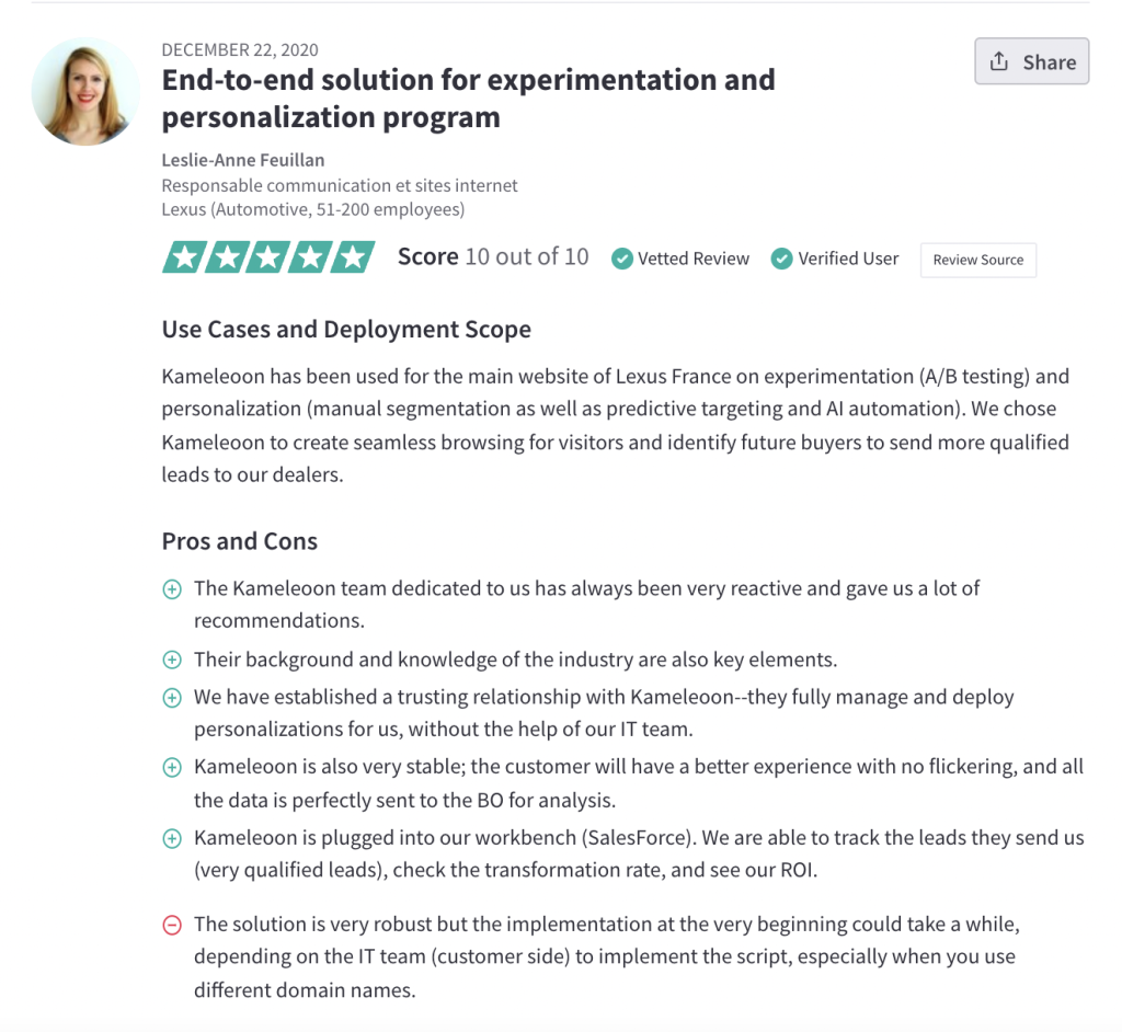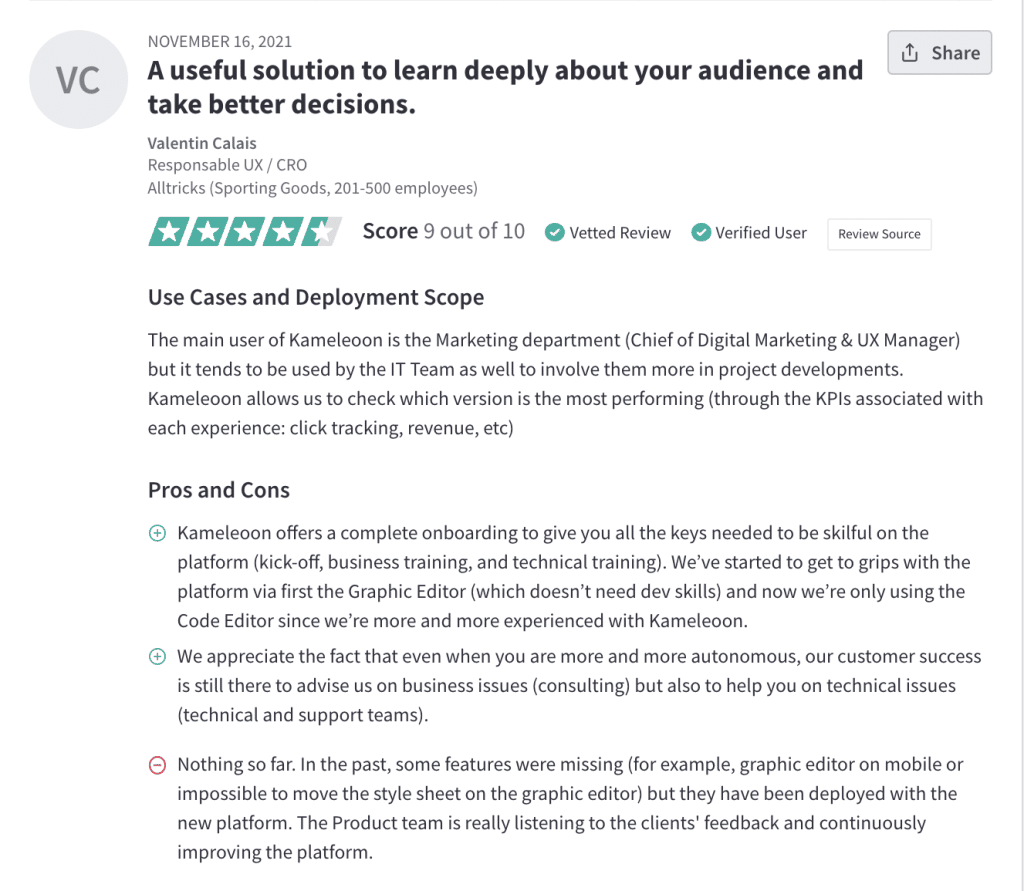 Here are some of the customer reviews on Kameleoon, according to the Trust Radius website: