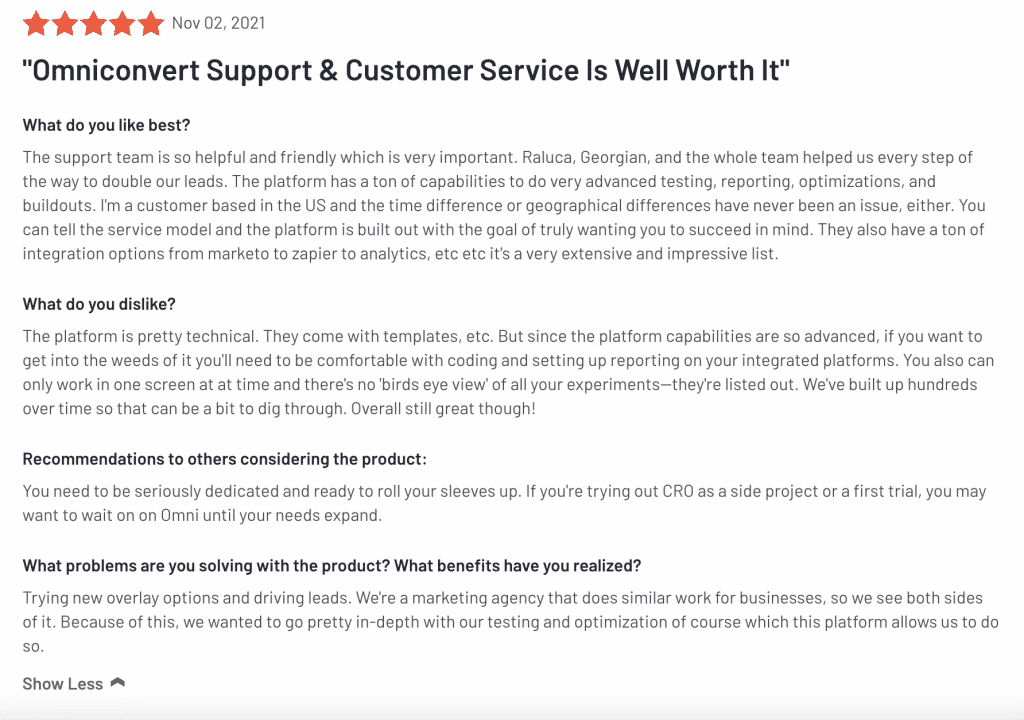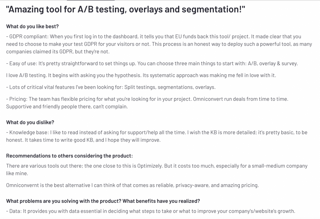 Here are some of the customer reviews on Omniconvert, according to G2 website:
