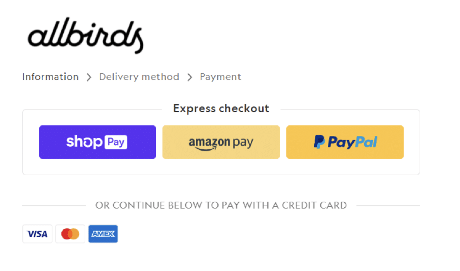 For example, Allbirds, a Shopify store, offers an optimized checkout form with an express checkout option through Shop Pay. With this option, customers can complete their purchase with just a few clicks without having to provide any additional details.