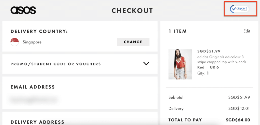 You can also take a look at this example from ASOS, a popular ecommerce brand that prominently displays its SSL certificate on the checkout page to attract customers. By doing this, they’re making their customers feel safe and secure while shopping on their platform.