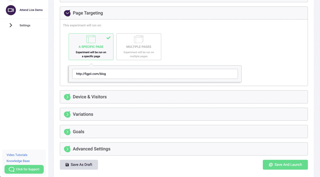- In page targeting, you can either run the experiment on a specific page, or on multiple pages.