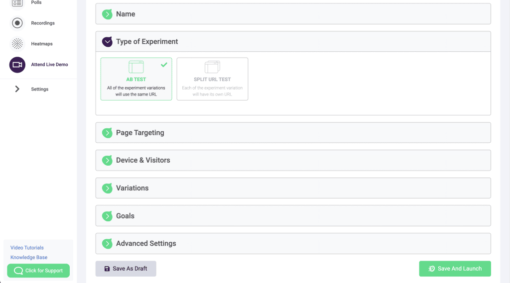 - Then, you must choose the experiment you want to launch. Either “AB test” or a “split URL test.”