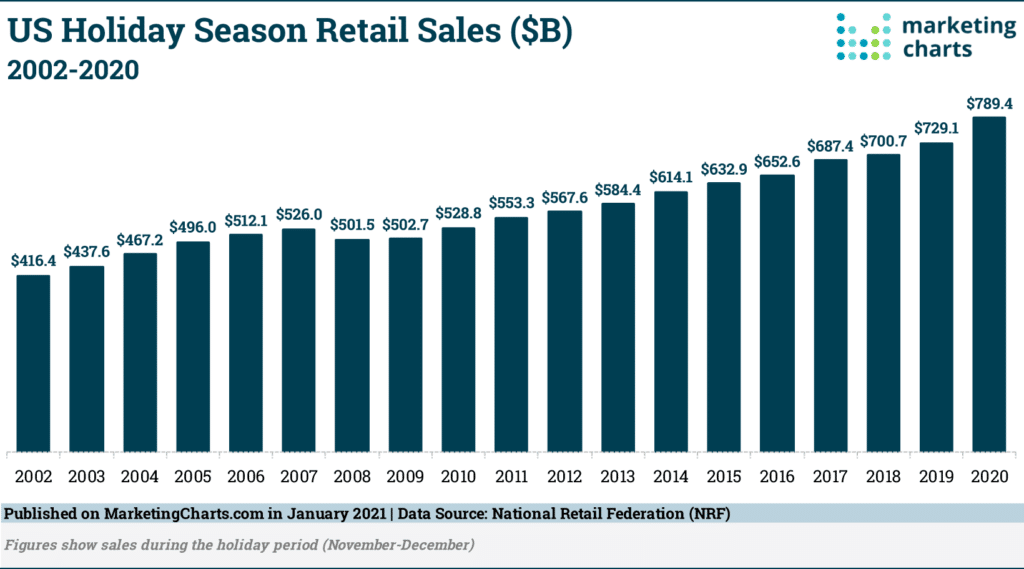 According to a survey by the National Retail Federation, holiday sales in the US reached $789.4 billion in 2020 – an 8.3% increase from the previous year.