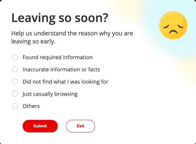 For example, in this exit pop-up poll, the company is trying to gauge why a website visitor is bouncing back from their website without taking action.