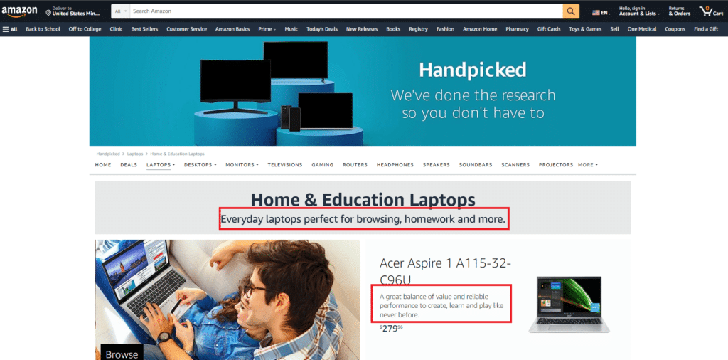 This is an example of a main category page on Amazon, “Computers,” with other subcategories under it.