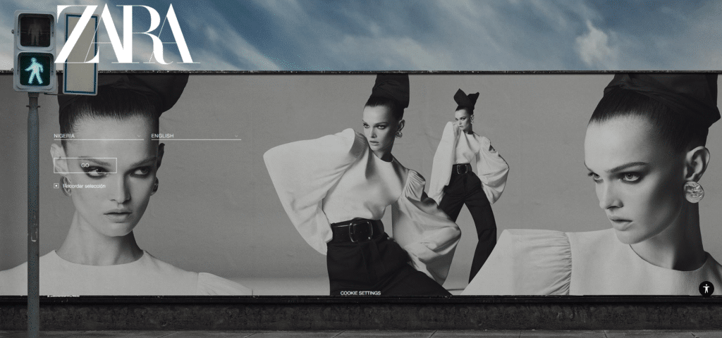 Zara’s hero image embraces editorial-style photography. It uses a monochrome aesthetic and bold posing to create a high-fashion, luxury feel that aligns with its brand identity.