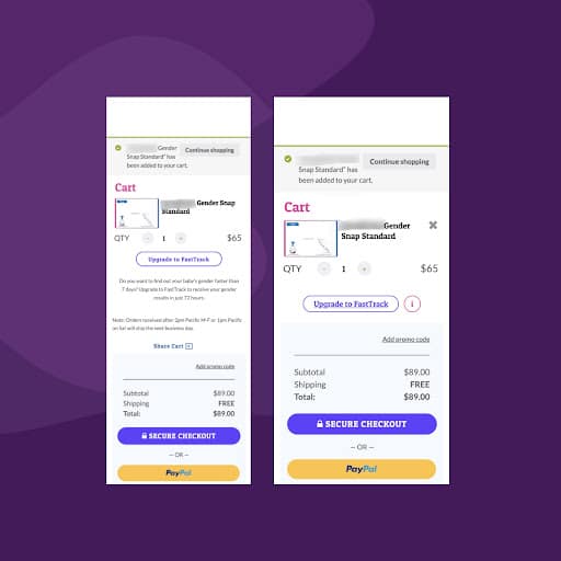 Visitors landed on the cart page immediately after adding an item to the cart. We thought that a pop-up on product pages would allow customers to continue shopping without going to the cart page each time.
