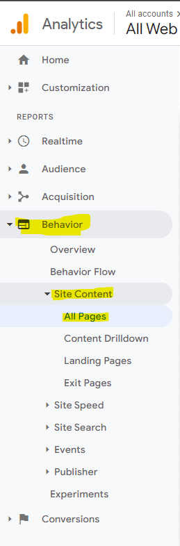 From the side menu in GA, head to Behavior, then site content, then all pages.