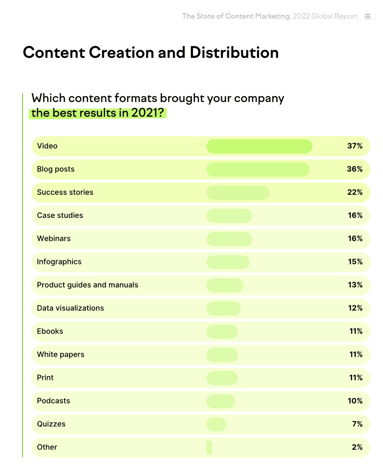 According to SEMRush’s report, videos have overcome blogs as the best performing type of content in 2022, and it doesn’t come as a surprise because people watch videos all the time.
